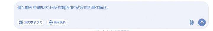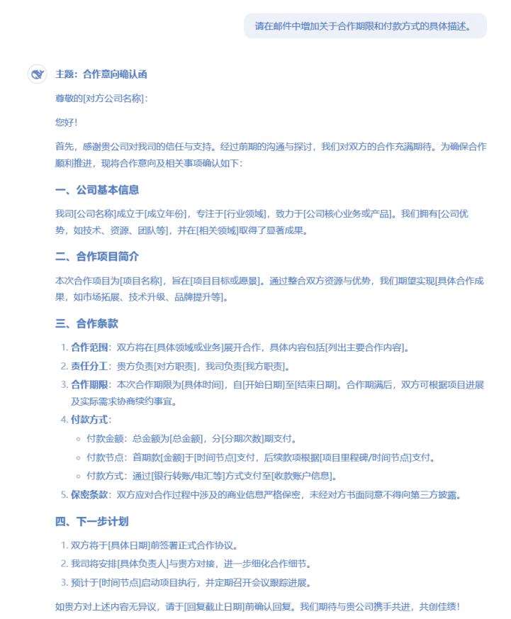 用户检查后可追加指令细化具体条款,如“请在邮件中增加关于合作期限和付款方式的具体描述。”