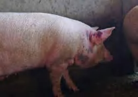 图1-1-18 猪链球菌病后肢关节肿胀,步态异常