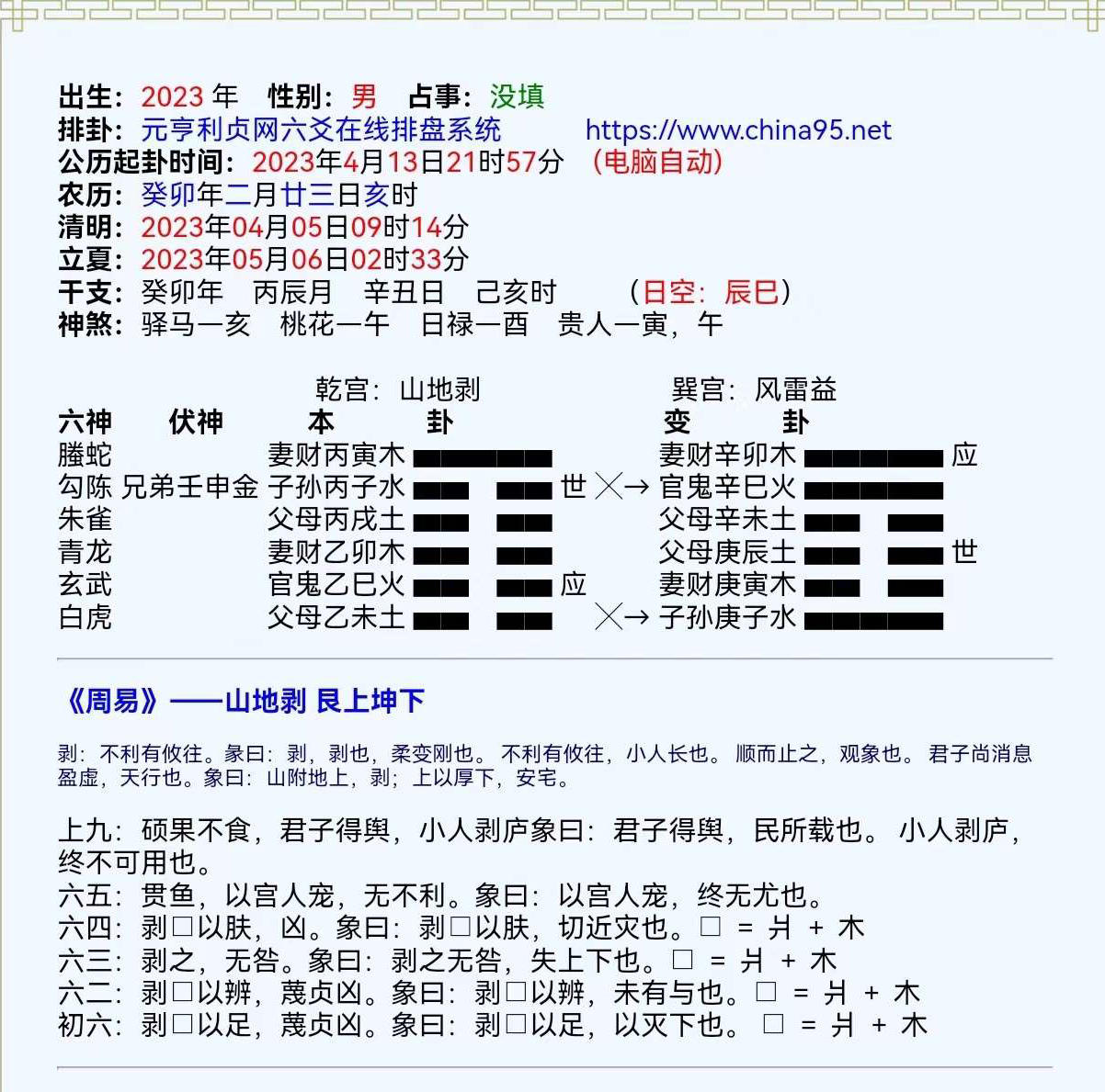 得到山地剥之风雷益,变爻是初六爻和六五爻。根据习惯,二个阴爻动,以上爻为主,兼看下爻。