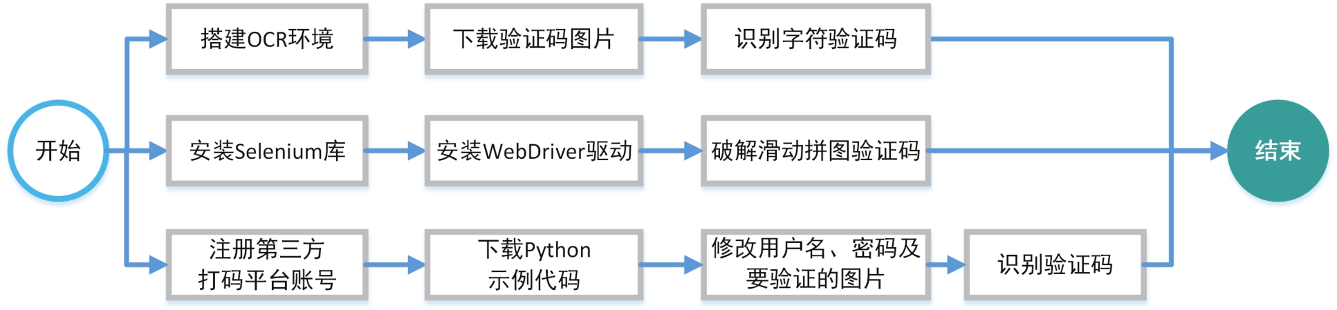 本项目的实现流程比较简单,使用3种技术实现验证码的识别或破解功能。其中:在识别普通的字符验证码时,需要使用OCR技术,因此首先需要搭建OCR环境,然后下载相应的验证码图片进行识别;在破解滑动拼图验证码时,需要借助Selenium自动化测试工具,因此首先需要安装相应的Selenium库和WebDriver驱动,然后编写代码进行破解;最后,本项目还借助第三方的打码平台识别验证码,这需要注册相应打码平台的账号,下载相应的示例代码,并将自己注册的用户名、密码,以及要识别的验证码图片传入相应的函数中,以实现识别验证码的功能。