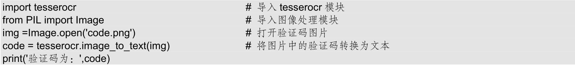 (4)使用Pillow模块和tesserocr模块对下载的验证码图片进行识别。具体实现时,首先通过Image.open()方法打开验证码图片,然后通过tesserocr.image_to_text()方法识别图片中的验证码信息并输出。代码如下: