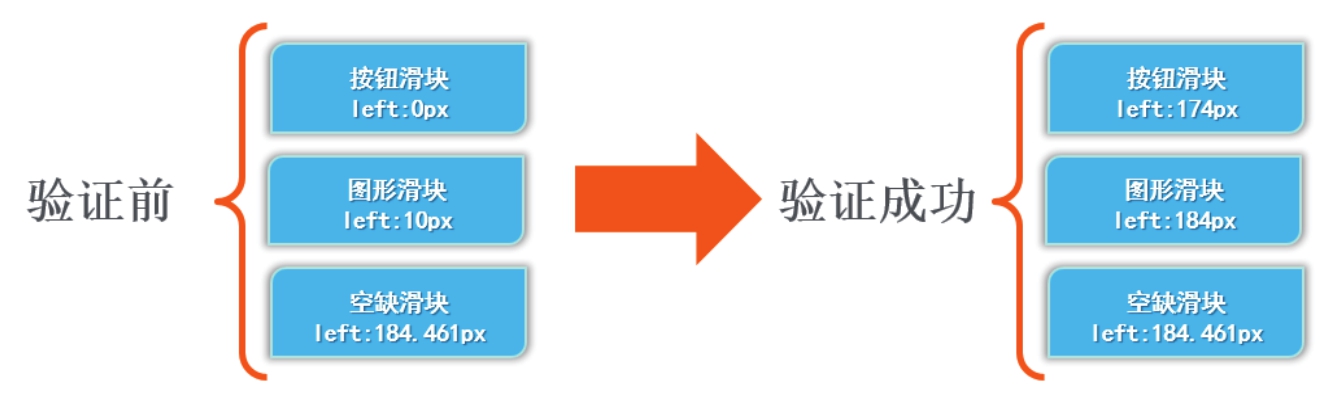对比图1.13与图1.14,可以看出:按钮滑块在默认情况下的位置为left:0px,图形滑块在默认情况下的位置为left:10px;而在验证成功后,按钮滑块的left值变为174px,图形滑块的left值变为184px。由此可以总结出整个验证过程中的滑块位置变化情况,如图1.15所示。