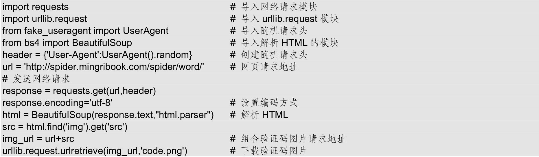 (3)向目标网页发送网络请求,并在返回的HTML代码中获取验证码图片的下载地址,然后将验证码图片下载到本地。代码如下: