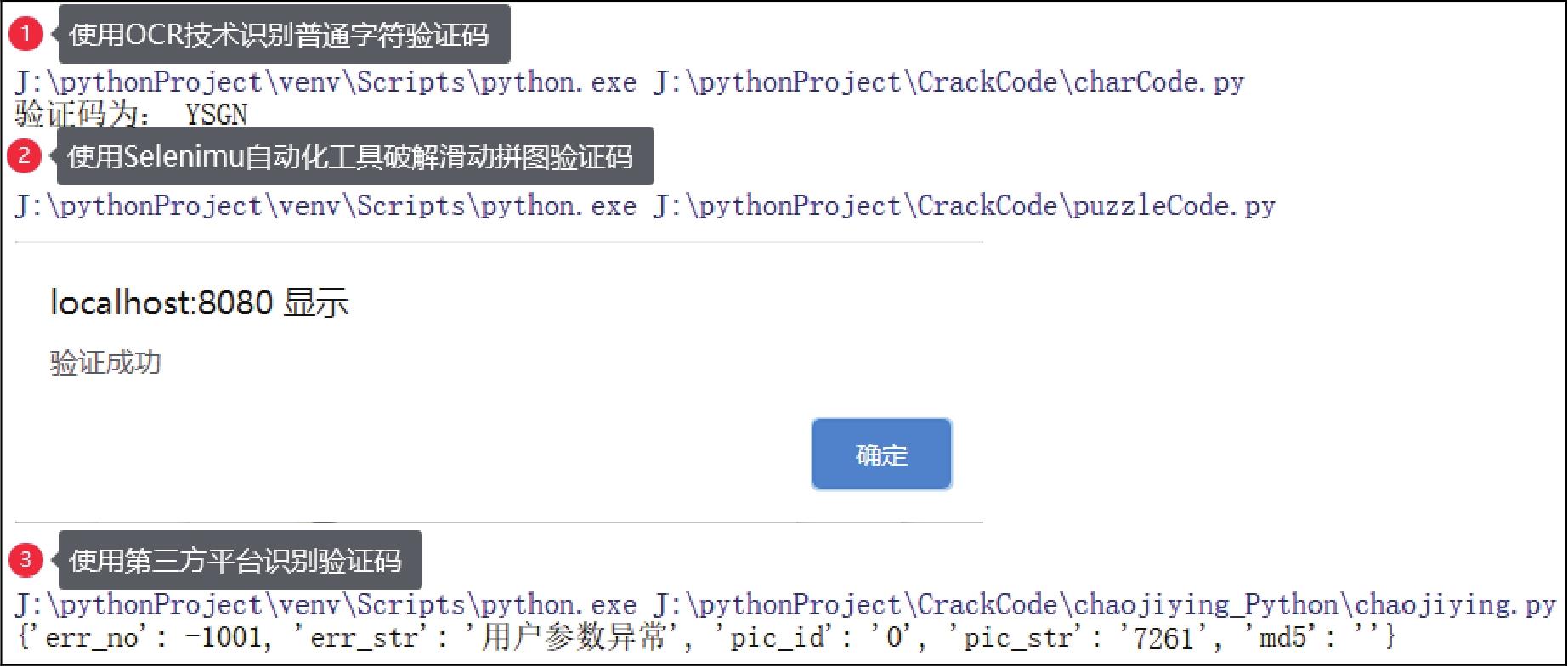 本项目的核心功能是智能破解验证码,主要使用了requests、BeautifulSoup(bs4)、Pillow、tesserocr和selenium等模块。其中:requests、BeautifulSoup(bs4)和Pillow模块用于向指定网站发送请求,并获取验证码图片;tesserocr模块主要用于通过OCR技术识别普通的字符验证码图片;selenium模块主要用于通过Selenium自动化测试工具破解滑动拼图验证码。此外,本项目还借助了第三方打码平台来识别验证码。
