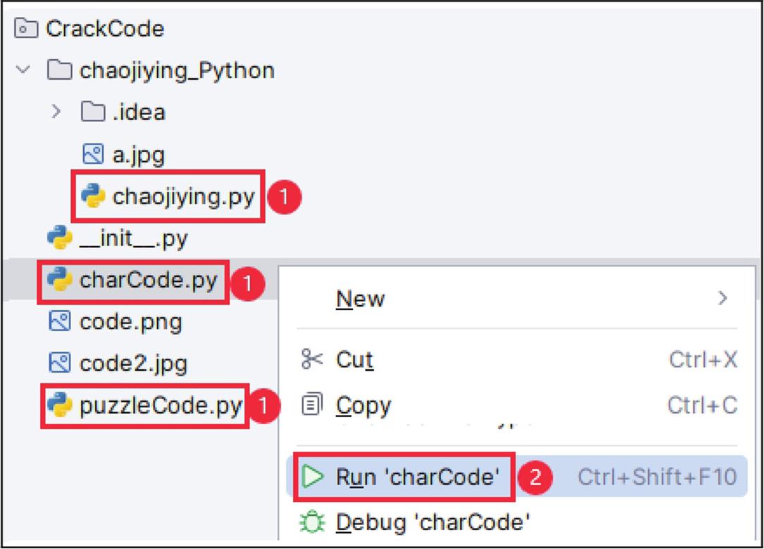 通过前述步骤,我们设计并完成了“智能破解验证码”项目的开发。接下来,我们将运行该项目以检验开发成果。如图1.21所示,在PyCharm的左侧项目结构中,展开“智能破解验证码”的项目文件夹,然后分别选中chaojiying.py、charCode.py和puzzleCode.py文件,右击,在弹出的快捷菜单中选择Run 'charCode',即可成功运行该项目。