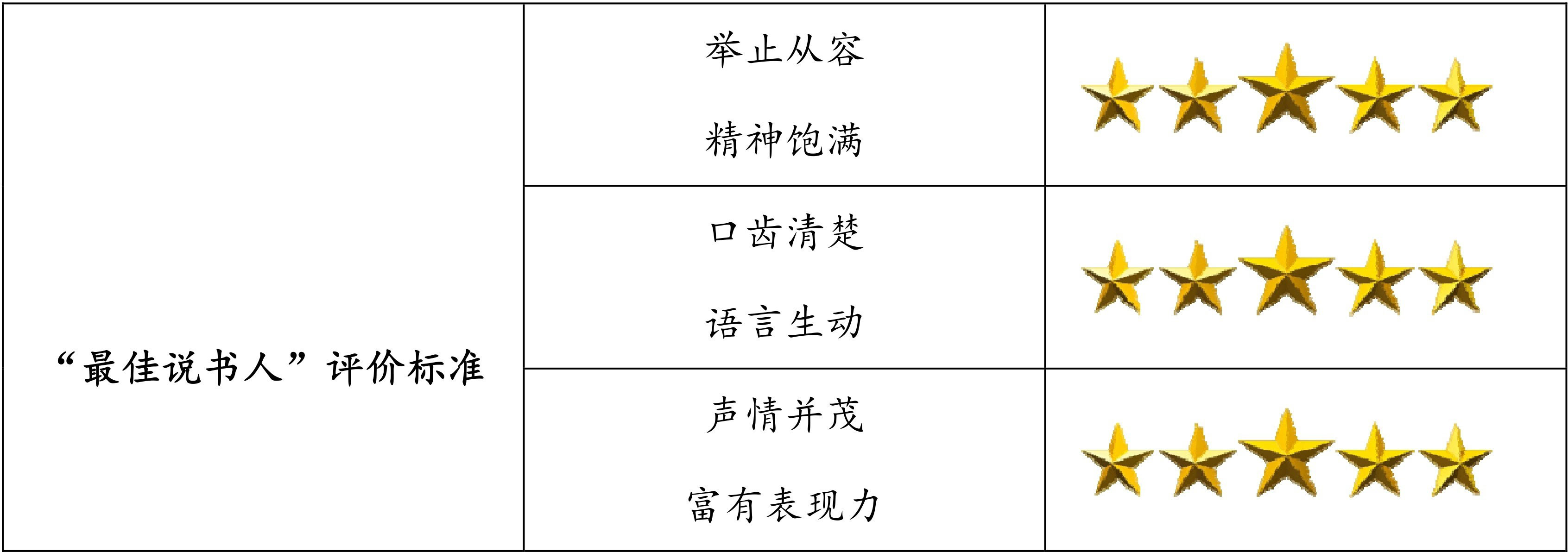(2)出示“最佳说书人”的评价标准,两位说书人,分别用不同的说书形式精彩展现《鲁提辖拳打镇关西》《汴京城杨志卖刀》两个故事。