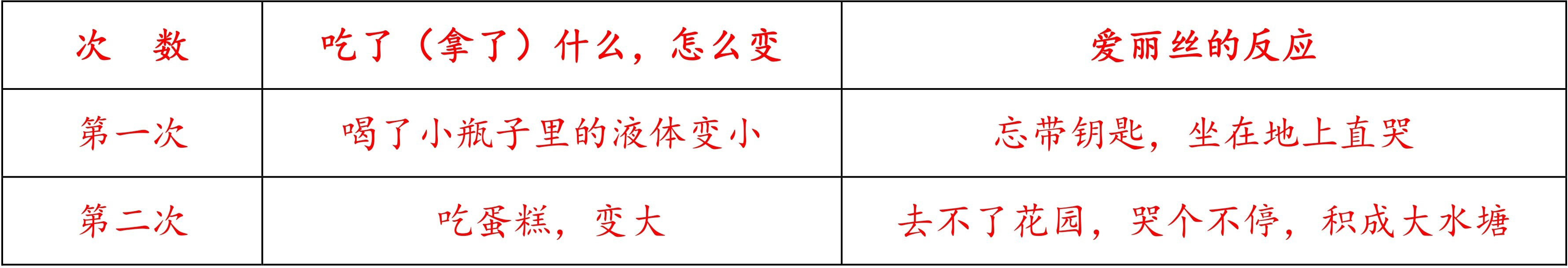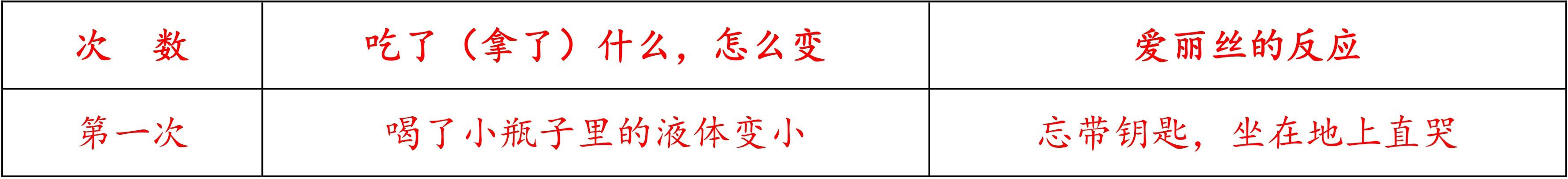 ②思考:哪位同学能借助下面的表格用简洁的语言说一说爱丽丝身体第一次发生的变化?学生思考之后进行交流。