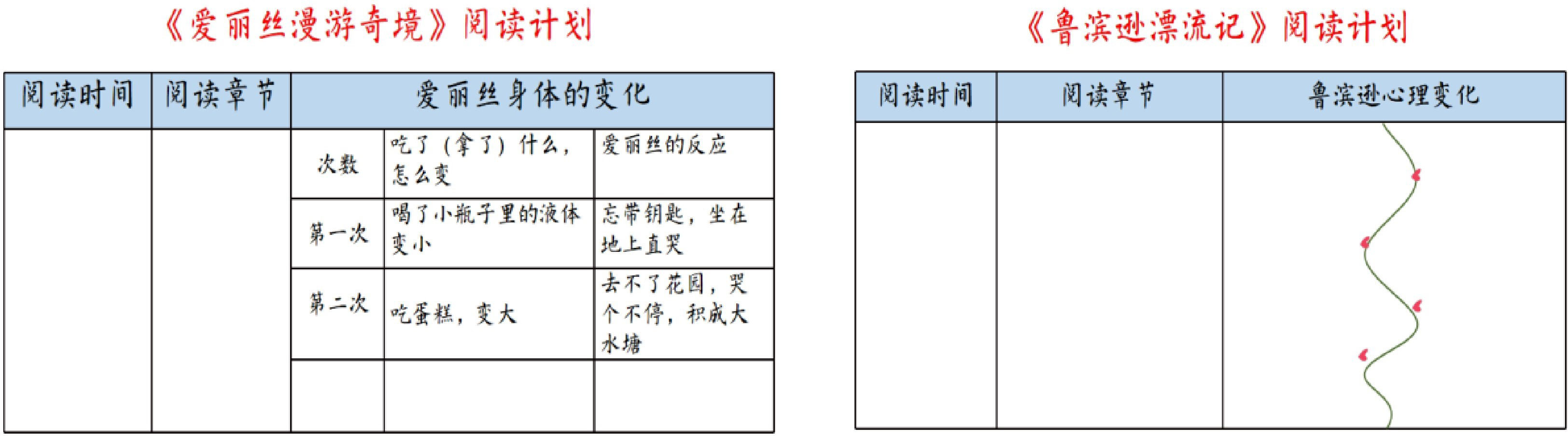 (2)出示阅读任务:圈画关键词,完善爱丽丝身体的变化以及鲁滨逊的心路历程。