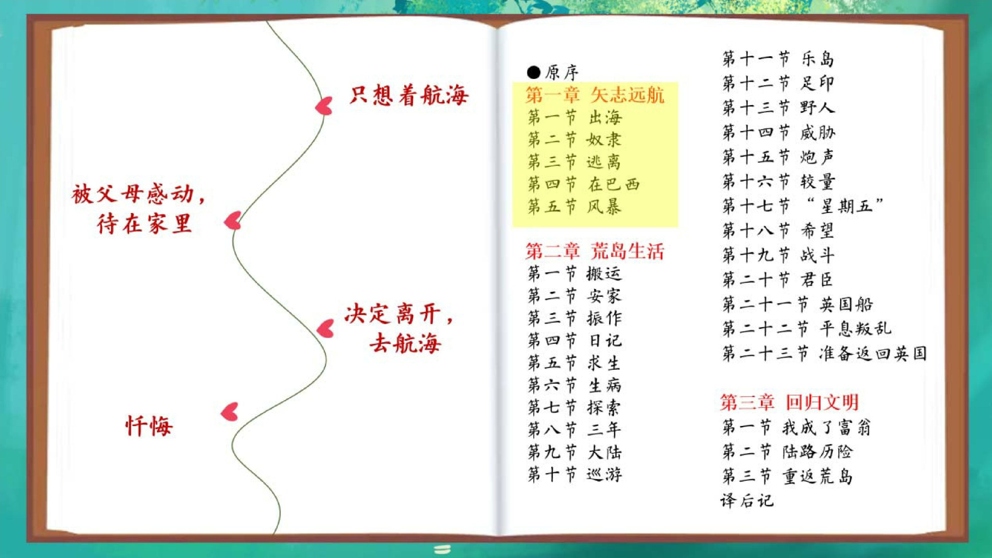 (1)出示“第一章 矢志远航”中“第一节 出海”片段,引导学生思考:鲁滨逊会听从他父亲的意见吗?预设:显然不会。在鲁滨逊看来,除了航海以外,别的一概都不乐意做。