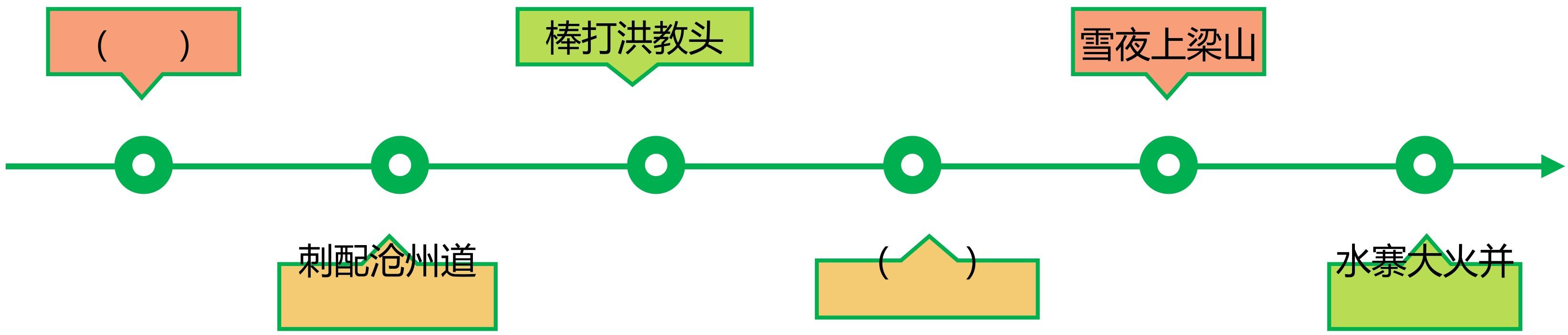 (6)小结:正所谓“官逼民反,民不得不反”,林冲虽然百般忍让,最终还是被“逼上梁山”,由此也有了一个成语:逼上梁山。