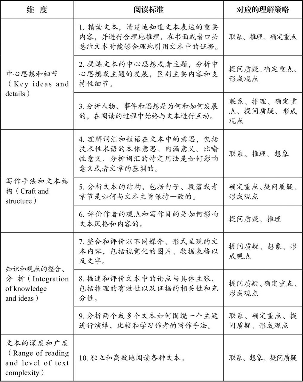 以下是美国共同核心课程标准(英语艺术)中阅读部分的阅读理解策略要求。