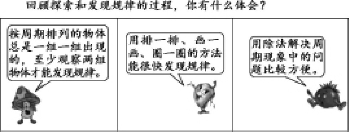 如苏教版教材四年级上册安排了“简单周期现象”作为研究对象的探索规律专题活动,着重观察生活中物体有规律的排列现象,发现并描述排列规律,还要根据规律对后续排列“第几个是什么”作出判断。教材以“观察周期排列现象—深入研究周期规律—根据规律作出简单判断—回顾探索规律过程”为线索编写,都强调引导学生经历“举例—观察—猜想—验证—归纳与反思”的过程。在“回顾探索规律过程”环节,教材创设的教学情境如下: