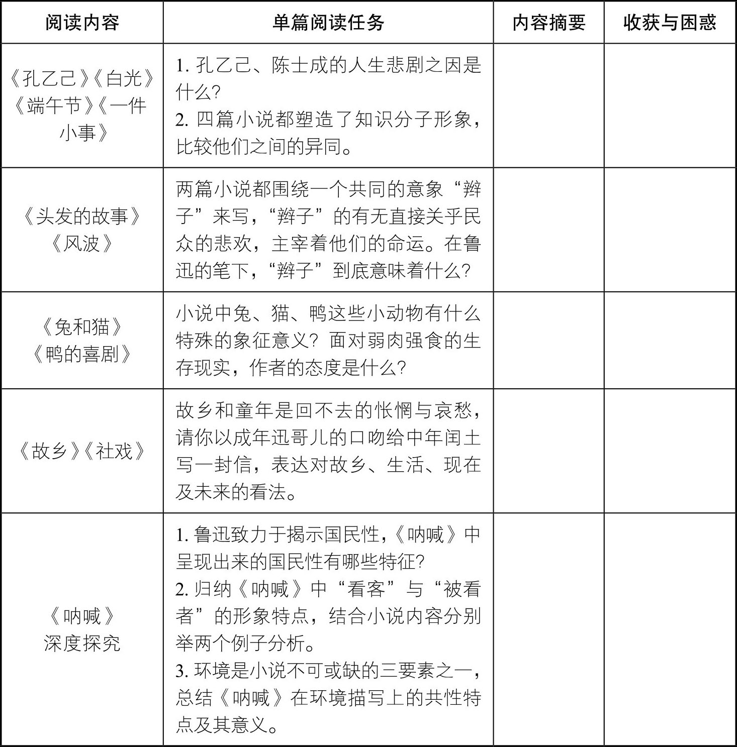 3.《呐喊》阅读任务清单(本课及之后各课的任务清单中,需整理与写作的“内容摘要”和“收获与困惑”均使用专门的笔记本完成,不在表格内填写):