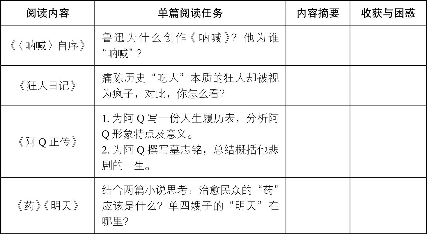 1.提前一周时间布置《呐喊》的整本书阅读任务。要求学生在一周内完成文本阅读,对每篇小说的人物、情节、环境、主题等内容进行梳理概括,并随时记录下阅读心得及疑问。