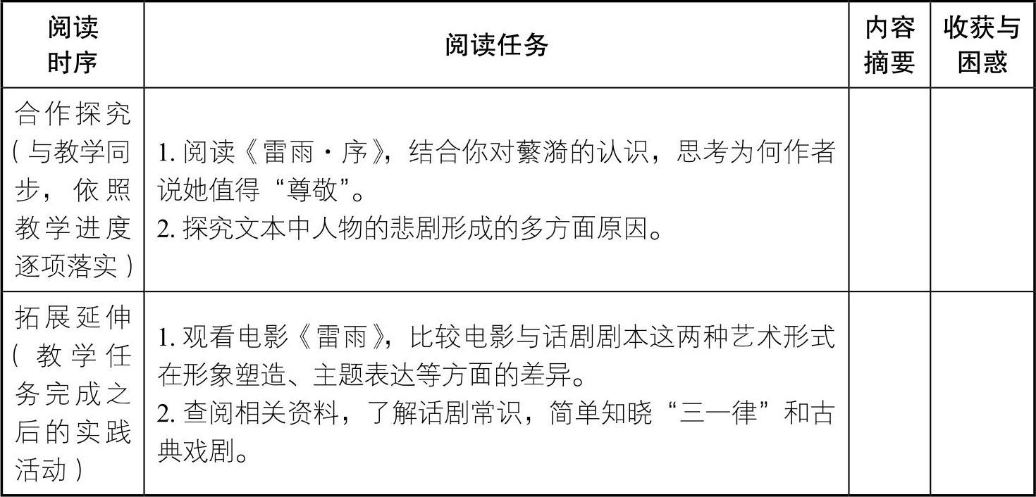 1.提前两周布置《雷雨》的阅读。一周时间初读作品,完成人物、情节、主题等信息的归纳整理,对阅读中形成的困惑以问题的方式进行归纳。第二周借助网络资源查阅曹禺《雷雨·序》、夏竹《曹禺与语文教师谈〈雷雨〉》、田本相《曹禺访谈记》、曹树钧《曹禺是怎样构思〈雷雨〉的》等相关文章。