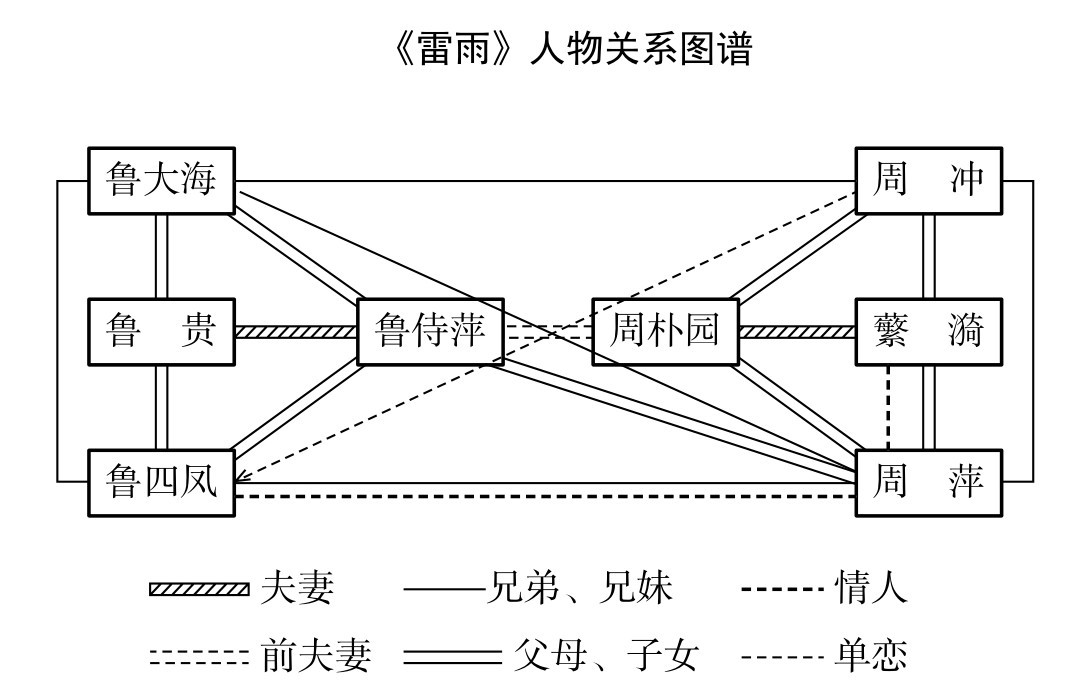 2.《雷雨》虽然只有八个人物,但关系错综复杂。请以学习小组为单位,交流各自绘制的《雷雨》人物关系图。(5分钟)