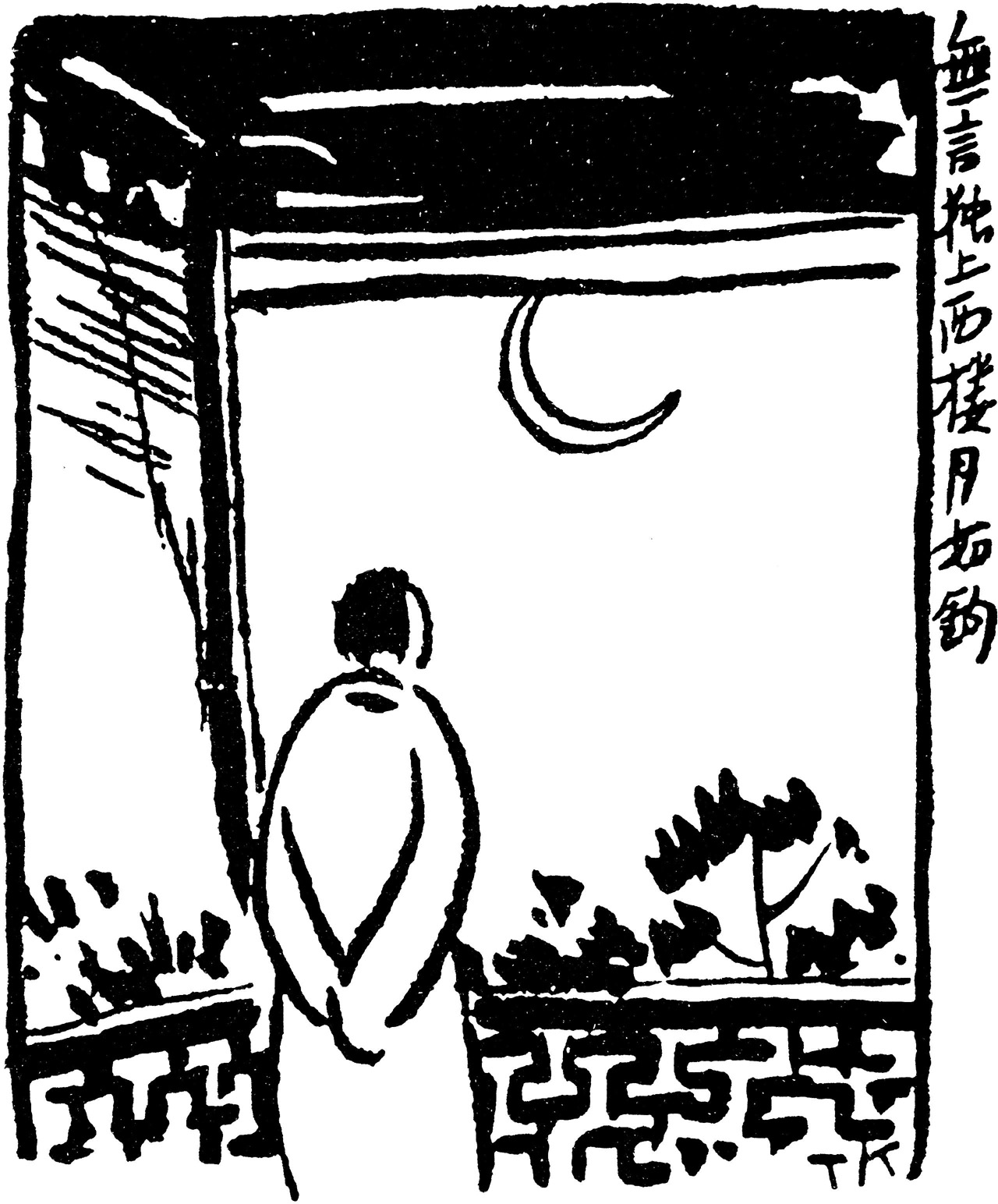 丰先生的《无言独上西楼月如钩》发表于1926年1月的《文学周报》,当时有人批评说:“这人是李后主,应该穿古装。你怎么画成穿大褂的现代人?”丰先生回答:“我不是作历史画,也不为李后主词作插图,我是描写读李词后所得体感的。我是现代人,我的体感当然作现代相。这才足证李词是千古不朽之作,而我的欣赏是被动的创作。”从此,酷爱古诗词的丰子恺开创出“古诗新画”的一片新天地。