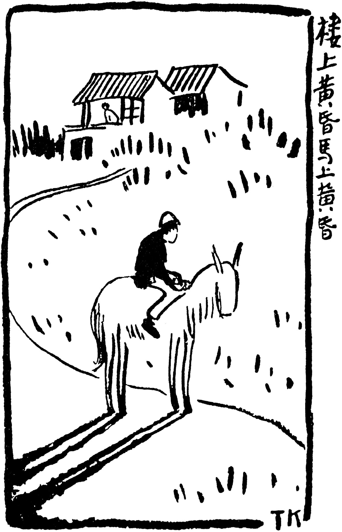 这也是子恺漫画中略微值得商榷的一幅画。丰先生的好友朱自清首先表示不喜爱:“你的画里也有我不爱的:如那幅《楼上黄昏,马上黄昏》,楼上与马上的实在隔得太近了。”俞平伯则认为“并非人物宜远宜近的问题”,而是“此种词句可否入画的问题”:“我觉这两句词本无画法。楼上黄昏,马上黄昏,在暮色笼罩下共此离思,此想当然耳。”