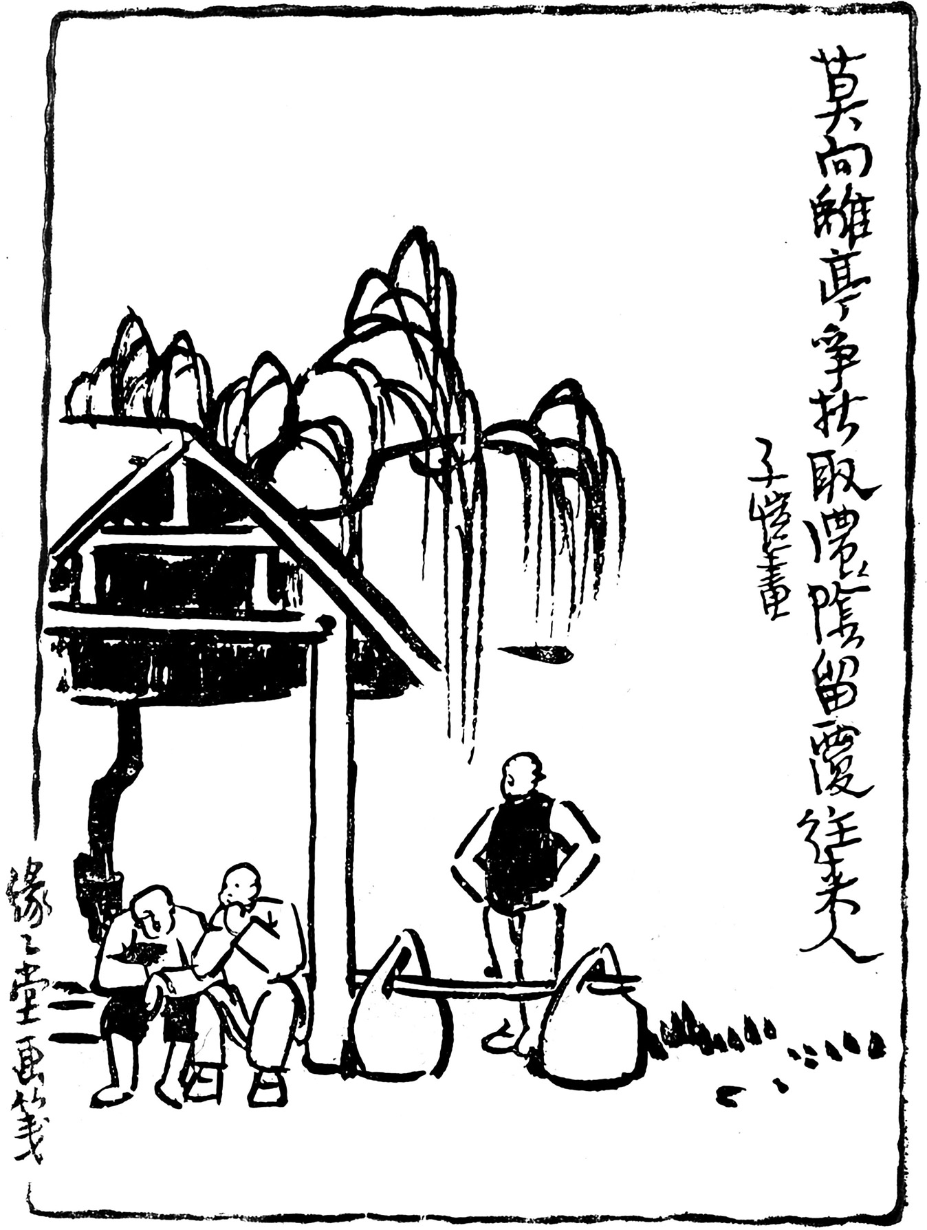1930年秋,丰子恺先生得了伤寒不得已辞去教职,迁居嘉兴杨柳湾金明寺弄4号租屋养病。这一病就是两三个月,病中无聊向家人索书看,家人为方便病人阅读,拿来最小又最轻的一册《随园诗话》,这一看,丰先生把十二本《随园诗话》全部读了一遍。读到精彩有趣的诗句,他都一一折角,漫画《莫向离亭争折取,浓阴留覆往来人》的题材就是取自《随园诗话》中折角的一页。