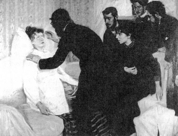 心理治疗师伯恩海姆在对患者做催眠(画者不详,油画)