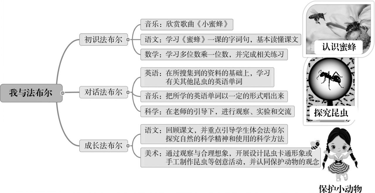 刚接触到“跨学科”这个词,第一感觉就是迷茫,为什么要跨学科?怎样进行跨学科教学设计?带着这些问题我们进行了认真的思考,查询了大量的资料,还专门请教了参加第一轮实验的老师,围绕“我与法布尔”为主题展开了跨学科设计(如图1.1所示),分设“初识法布尔”、“对话法布尔”、“成长法布尔”三个子主题来建构三年级的跨学科教学活动。信息技术课作为活动开展的前置课程,先由相关教师指导学生提前查询相关网站搜集昆虫图片。通过学习音乐和语文大课、数学课(多位数乘一位数)、英语和音乐大课(将昆虫的英语单词唱成歌),学生能够掌握有关昆虫的基本知识。通过学习科学课(观察方法)、语文课(探究精神和科学态度)、美术课(形象设计、环保意识和自然观念),学生可以获得有关自然科学和生态环保的知识。