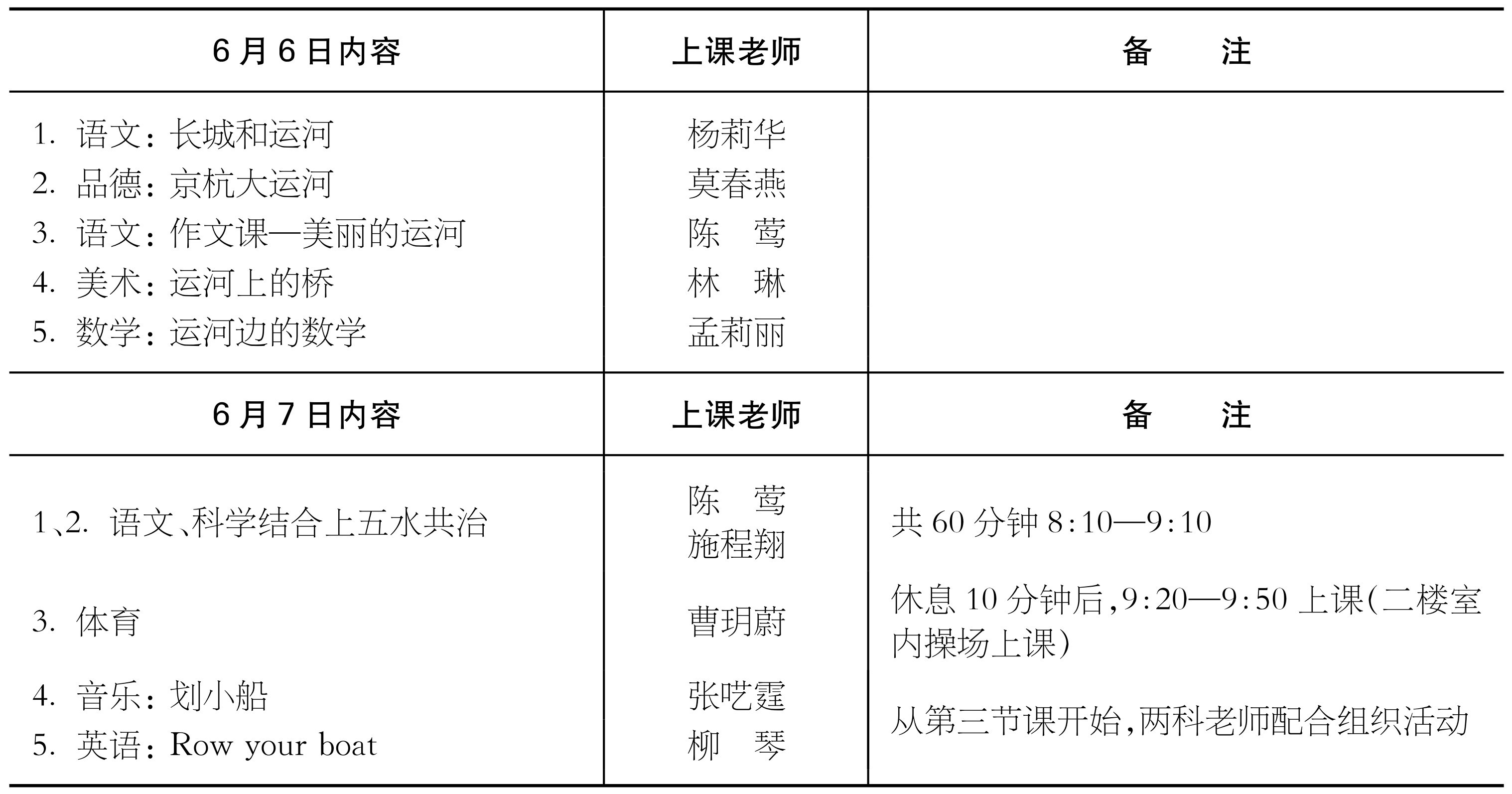 “美丽的大自然”从《荷花》引入,语文课上学习《荷花》,欣赏荷花的美,并用语言描述它的美,美术课上以美术视角描绘它的美,从而表达出对荷花的认识,科学课“开花了 结果了”进一步研究花的结构及观察推测花变成果实的过程,更进一步细节上认识荷花,接着数学课结合本主题进行“面积”的练习课,接下来语文课继续学习《我爱故乡的杨梅》,进一步观察认识,并进行热爱大自然的情感教育。最后英语、音乐课围绕本主题进一步培养审美情趣和热爱大自然的感情。“水文化周”围绕我校的水文化整合一到三年级的相关内容,紧紧围绕运河的美、古人治水、水净化等内容展开,几个学科融合在一起,实现了知识技能、情感、态度的统一。(内容见表1.1)