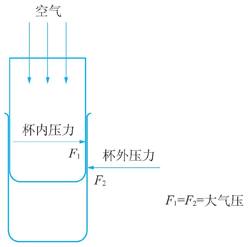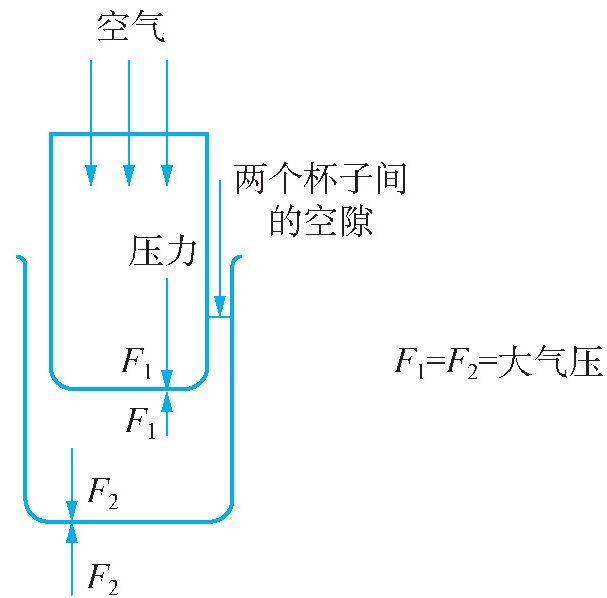 (注解:杯内压力F1=杯外压力F2,两个杯子之间无缝隙,在内外空气压力作用下,很难分开。)