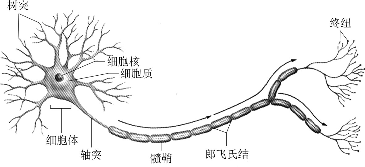神经元具有接收刺激、传递和整合信息的功能。图1-2-1表现的是神经元沿着一个方向传递信息的状态,树突和细胞体接收传来的信息,细胞体对信息进行整合,通过轴突将信息传给另一个神经元或效应器。