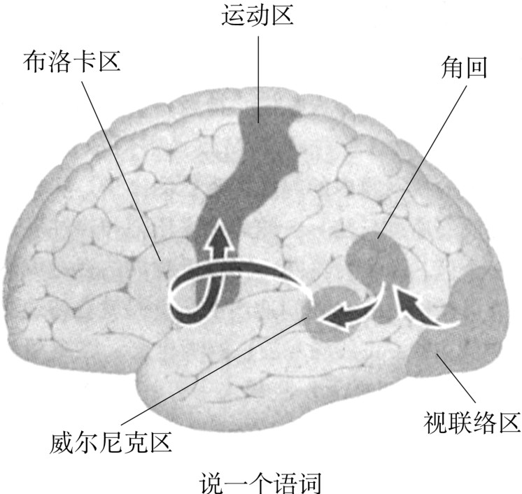 因此,当一个人在大声朗读课文时,语词:(1)先在视觉区登记;(2)再传递至角回,角回会将这些语词转化为听觉编码;(3)然后传至威尔尼克区使人接收并理解其含义;(4)最后传递至布洛卡区;(5)由布洛卡区控制朗读者的运动区,使其最终被念出。如果这个链条中的某个连接部分受到损伤,那么个体就会患上不同形式的失语症。角回受到损伤的人能说、能理解,但不能阅读。威尔尼克区受到损伤会影响人的理解能力。布洛卡区受到损伤则会影响人的表达能力(如图1-2-6所示)。