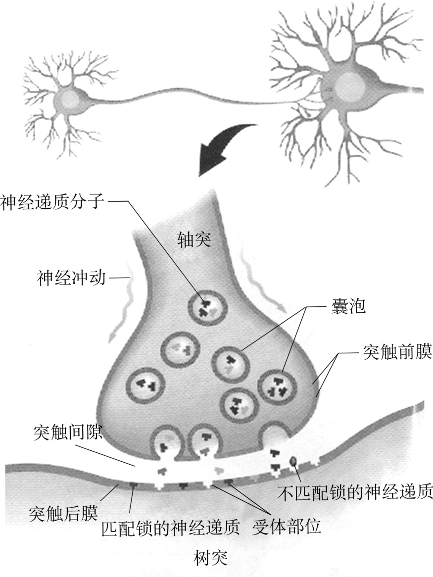 突触是控制信息传递的关键部位,它决定着信息传递的方向、范围和性质。突触分为突触前膜(发送信息的神经元的终纽)、突触后膜(接收信息的神经元的树突或细胞体)和两者之间的突触间隙。当一个神经元内的神经冲动传到轴突末梢时,突触前膜、轴突末端膨大的突触小体中的突触囊泡内所存储的神经递质(引起其他神经元兴奋的化学物质)就被释放出来,进入到突触间隙。进入突触间隙的神经化学递质与突触后膜的受体分子结合,引起突触后膜电位变化,产生突触后电位,实现了神经冲动的传递(如图1-2-2所示)。以神经递质为媒介的突触传递,是人脑内信息传递的主要方式。人脑中约有一百多种神经递质,如乙酰胆碱、去甲肾上腺素、5-羟色胺、多巴胺等。乙酰胆碱对学习和记忆具有重要作用,也是连接运动神经元和骨骼肌的信使。去甲肾上腺素辅助控制警觉和唤醒。5-羟色胺会影响人的情绪、饥饿和睡眠。多巴胺则影响人的运动、学习、注意和情绪等。