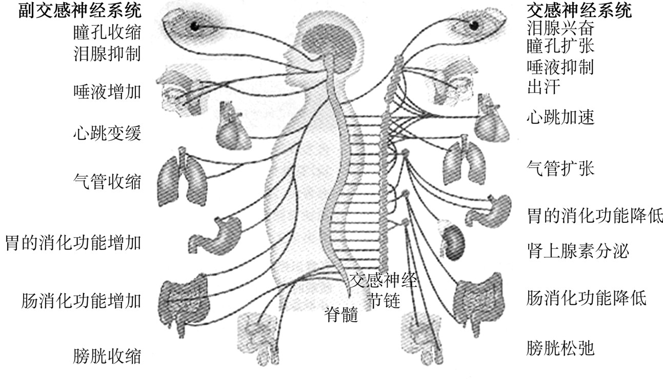 自主神经系统分为交感神经系统和副交感神经系统,它们在人的生理机能活动中起着相反、相成的作用。交感神经系统负责在应激性紧急情况下集中资源,唤醒躯体采取行动来应对危险。副交感神经系统负责平息身体在紧急情况下被交感神经系统调动起来的状态,使身体继续储存能量,维持内部机能的常规活动,或使兴奋的躯体回到较低唤醒水平。交感神经系统和副交感神经系统协同活动,以维持身体内部状态的稳定。