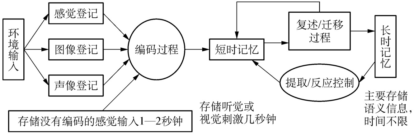 从图中可知,外界信息通过感觉器官时,会按输入信息原样的感觉痕迹形式被登记,包括感觉登记、图像登记和声像登记等,这就是感觉记忆系统,信息在此保持的时间很短,一般不超过两秒钟,其中一部分信息由于受到了注意而进入短时记忆系统,如果信息极为强烈、深刻,也会一次性直接进入长时记忆系统。但是,如果感觉记忆中的信息未被注意,则它们会很快减弱、消失。短时记忆系统中的信息主要来自感觉记忆,也有些是从长时记忆系统来的信息。当某人需要运用已有知识经验、规则来加工信息时,其便会从长时记忆中提取相应信息,提取出的信息会回溯到短时记忆系统,帮助短时记忆系统对信息进行有意识的加工。短时记忆系统中的信息经过复述后进入长时记忆系统得到长久保存。