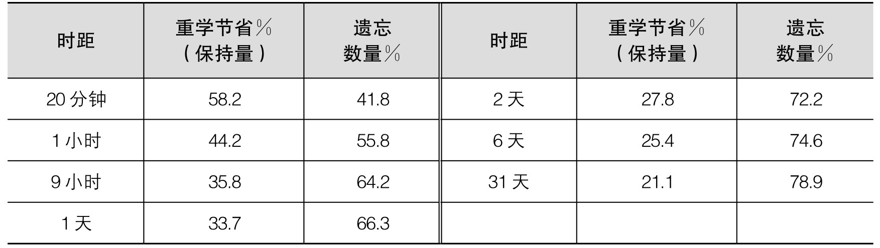 德国心理学家艾宾浩斯(H.Ebbinghaus)对记忆和遗忘规律进行了实验研究。在实验中,为了排除过去知识经验、个人情绪对记忆结果的影响,消除新学习材料与记忆中原有知识经验的可能联系,他创制了无意义音节字表作为记忆实验材料,以及重学法等统计处理方法。无意义音节字表是由两个辅音和一个元音组成的字母串,如POF、XEM和QAZ等。在实验中,被试每次要识记一定数量的无意义音节,直到连续两次背诵无误。然后经过不同时距后再进行回忆,如果有的音节不能回忆出来,就重新学习,间隔时间分别为20分钟、1小时、9小时、1天、2天、6天、31天,直到再次达到背诵无误的标准。艾宾浩斯把重学时比初学时节省的诵读时间百分数作为保持量指标,并据此测量出遗忘进程,实验结果如表1-5-1所示。