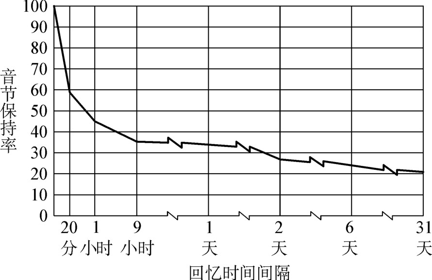 德国心理学家艾宾浩斯(H.Ebbinghaus)对记忆和遗忘规律进行了实验研究。在实验中,为了排除过去知识经验、个人情绪对记忆结果的影响,消除新学习材料与记忆中原有知识经验的可能联系,他创制了无意义音节字表作为记忆实验材料,以及重学法等统计处理方法。无意义音节字表是由两个辅音和一个元音组成的字母串,如POF、XEM和QAZ等。在实验中,被试每次要识记一定数量的无意义音节,直到连续两次背诵无误。然后经过不同时距后再进行回忆,如果有的音节不能回忆出来,就重新学习,间隔时间分别为20分钟、1小时、9小时、1天、2天、6天、31天,直到再次达到背诵无误的标准。艾宾浩斯把重学时比初学时节省的诵读时间百分数作为保持量指标,并据此测量出遗忘进程,实验结果如表1-5-1所示。