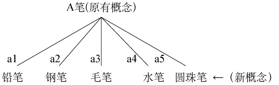派生类属学习是指认知结构中原有概念是一个上位概念,所学新概念或接收到的新信息是这个上位概念的一个特征(属性)或一个例证。例如,原有认知结构中概念有“笔”(A),而”笔”这个概念是通过概括了“铅笔”(a1)、“钢笔”(a2)、“毛笔”(a3)、“水笔”(a4)等各种各样笔的从属概念而构成的。现在要学习新概念“圆珠笔”(a5)这个概念时,“圆珠笔”这个刺激信息就会被纳入原有认知结构“笔”这个概念之中。概念掌握的派生类属学习,可以使原有的概念得到充实或证实,但不能使原有概念产生本质上的改变(如图1-7-1所示)。