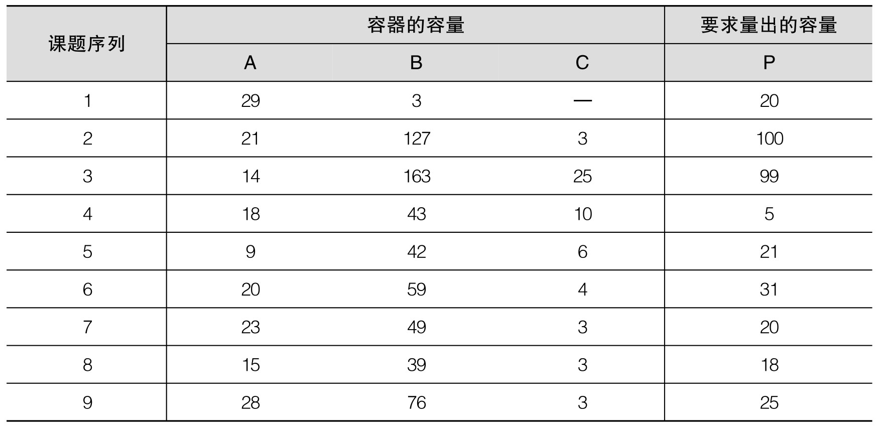 思维定式是指问题解决者原有的知识经验对当前问题解决的心理准备状态,是功能固着的泛化。思维定式既可能在解决问题过程中发挥积极作用,加快问题解决的速度,也可能使思维呆滞,导致个体无法根据实际情况灵活地解决问题,阻碍创造性思维的发展,影响问题解决的效率和质量。思维定式的著名研究是陆钦斯(A.S. Luchins)的量水实验。实验中要求被试用大小不同的容器量出一定量的水,用数字进行计算(如表1-7-1所示)。
