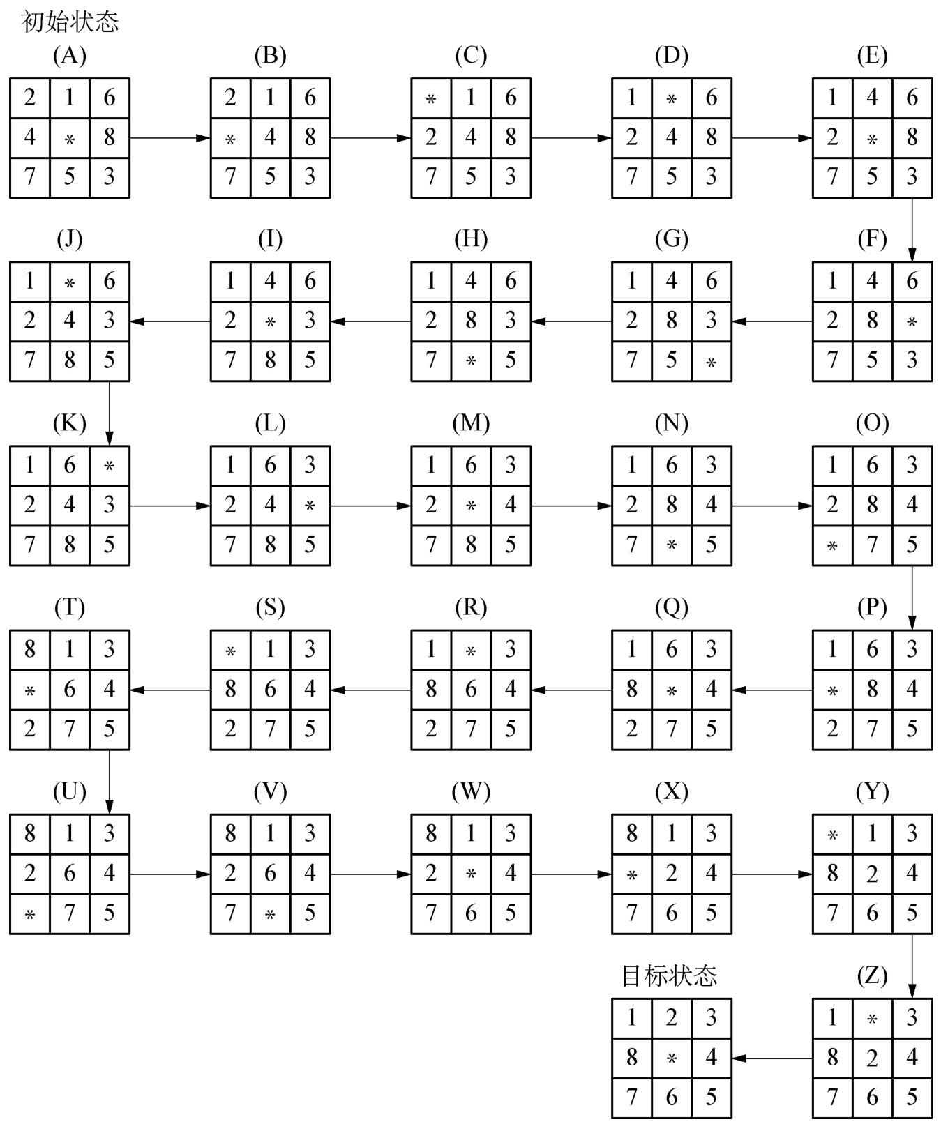 图1-7-6 解决“八张牌”问题空间的移牌步骤序列