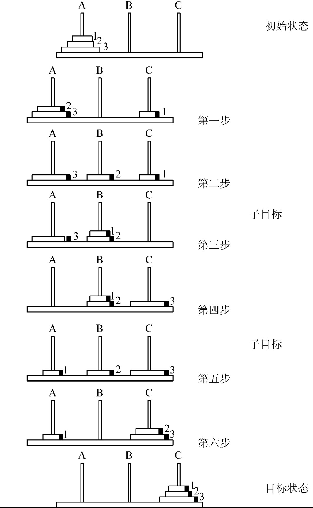 图1-7-7 解决“河内塔”问题的具体步骤