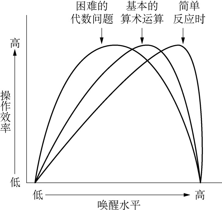 人对活动的态度、责任感、兴趣等都会对问题解决的效果产生影响。就动机而言,动机强度不同,对解决问题效率的影响大小也不一样。实验研究表明,在一定限度内,动机强度与解决问题效率之间的关系呈倒“U”字形曲线。太弱或太强的动机水平都不利于问题的解决,中等强度的动机水平则能使人最有效地解决问题。若动机水平超过一定限度,容易出现情绪紧张、思维紊乱、注意范围狭窄、动作紊乱、失误增多等情况,反而会降低解决问题的效率,这就是耶克斯—多德森定律(The Yerkes-Dodson's Law)(如图1-7-9所示)。