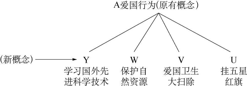 相关类属学习是指认知结构中原有概念是一个上位概念,所学的新概念或接收到的新信息只是对这个上位概念的深化、扩充、修饰或限定。这个概念学习形式可使已有的上位概念的本质特征发生改变。例如,对认知结构中原有概念“爱国行为”(A)的已有理解有“挂五星红旗”(U)、“爱国卫生大扫除”(V)、“保护自然资源”(W),现在有“学习国外先进科学技术”(Y)。当把这个新的信息纳入爱国行为中时,原来认知结构中的“爱国行为”的内涵被深化、被重新建构了,从而使概念内涵获得了更深刻的意义和更广泛的外延(如图1-7-2所示)。概念掌握过程是一个从简单到复杂,从低级到高级的过程。许多概念的掌握,都经历了一个不断深化、扩展的过程,这个学习过程比较符合人认识客观事物的规律。