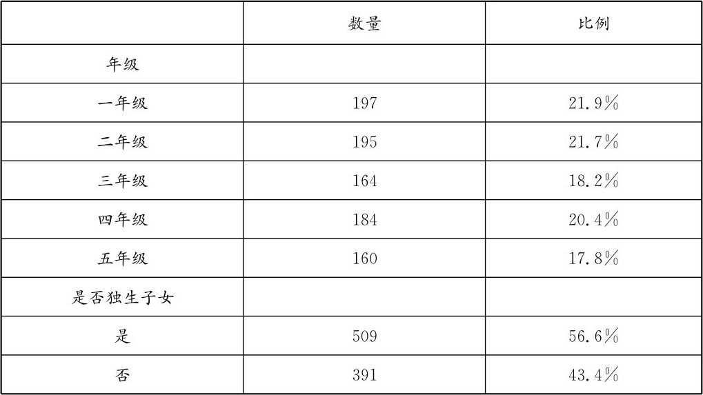 在文献法的基础上,采用问卷调查法,通过对小学儿童的童心现状与发展趋势进行考察,为建设基于童心的课堂心理环境奠定初步的基础。本次调查时间是2019年9月,选取育童小学900名小学生作为样本,具体样本的分布情况如表3-1所示。