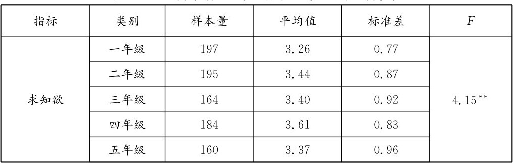 对不同年级儿童的求知欲进行分析,从表3-5可知,育童小学各年级儿童在求知欲上存在显著的年级差异( F =4.15, p <0.01)。通过事后分析( LSD )发现,育童小学四年级儿童的求知欲相对来说最强。