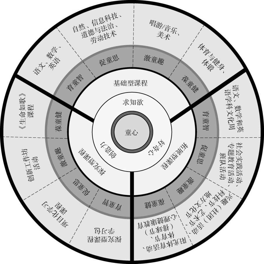 童心课程是在童心教育的理念下形成的具有实践价值的学校发展方式。童心课程不仅秉承童心教育的真谛,同时也整合课程本身独有的目标,形成童心教育的课程体系:在国家课程目标的基础上和学校童心教育理念的指导下,童心课程的设置突出对“好奇心”“求知欲”“创造力”的培养。在以学科为基础的课程中实现能力的培养,在以活动为基础的课程中突出知识的转化与实践应用能力的培养。