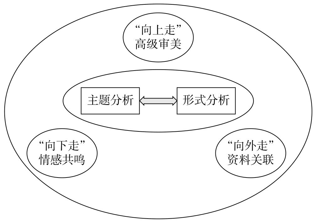 与讲《背影》指向“感恩父母”“反思自我”一样,这三个教学目标指向了价值观教育而不是艺术赏析。可以想见,思品课和班会课如果用这篇文章做素材,讲这些内容,效果一定会很好。但如果语文老师也只讲这些内容,岂不是“荒了语文的田,种了其他学科的地”?那么,我们该如何对这篇课文进行审美解读呢?下图(见下页)表明了文学文本解读的方法与策略:“两个指向”——主题分析和形式分析,以及“三个路径”——“‘向下走’——情感共鸣”“‘向上走’——高级审美”“‘向外走’——资料关联”。