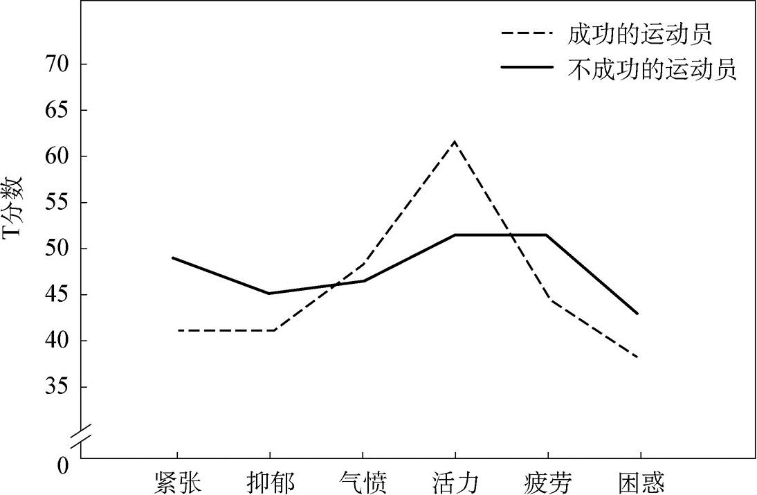 利用交互作用的模式,体育运动心理学的研究者便能够为优秀运动员确定他们的心理图像。在图7-3中的10项心理因素中,有3项是人格特质,其余7项是心境状态。这10项心理因素能够有效地预测运动员的运动表现。