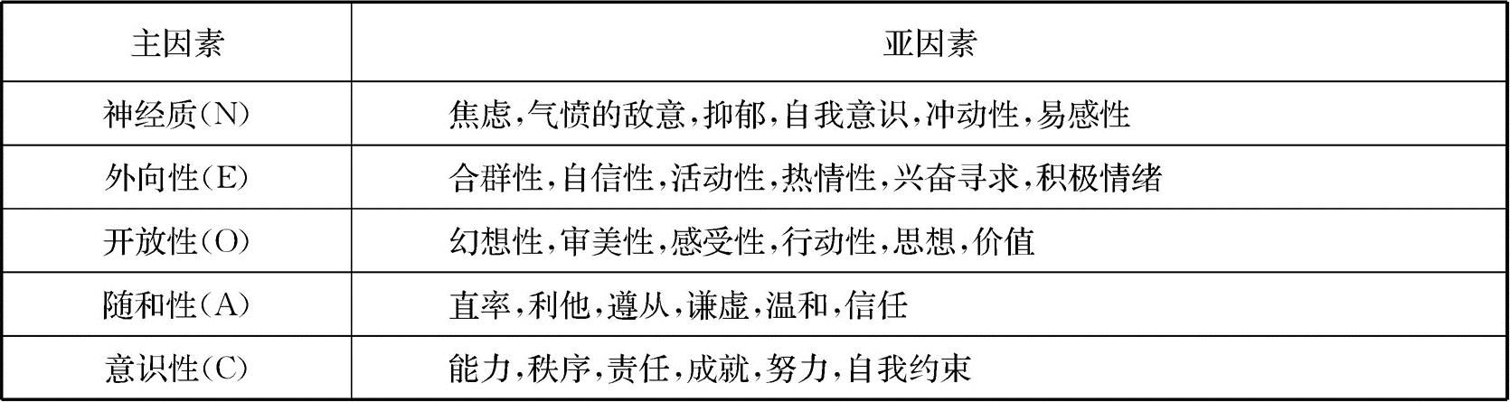经过漫长的探索,诺曼(Norman,1963,1967)等一批人格心理学家似乎逐渐达成了共识,认为人格维度有5个。1949年至1981年的人格维度研究表明(John,1990),以下五大特质因素是这些研究的共同归宿:神经质(neuroticism)、外倾性(extraversion)、开放性(openness to experience)、随和性(agreeableness)和意识性(conscientiousness)。为便于记忆,可将这五大人格特质因素的英文首字母构成OCEAN一词,意为“人格的海洋”,中文可称大五人格(Big Five Personality)。