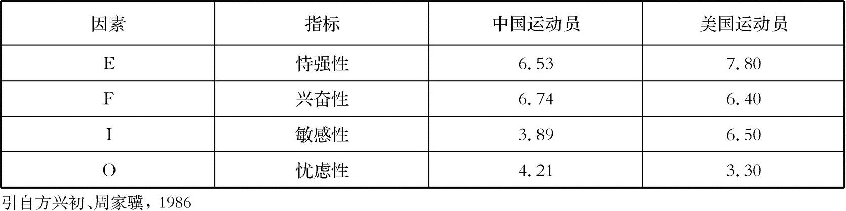方兴初、周家骥(1986)在该研究中还将上海地区20名世界冠军、世界纪录创造者具有的上述4项典型特征,与美国伊利诺州大学人格及能力测验研究所用16PF测验世界性运动会的美国优胜选手所得结果进行了比较(表7-4)。