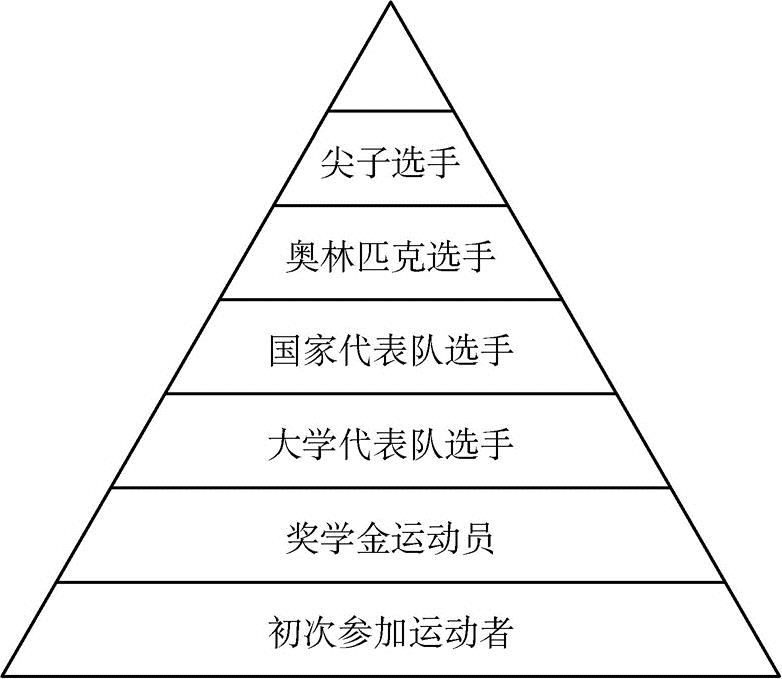 西尔瓦(Silva,1984)对此现象提供了一种看上去有些道理的解释。他认为,如图7-1所示,当运动员从运动技能水平的金字塔底部移向塔尖时,他们之间的人格特征和其他心理特征也越来越接近,而在体育运动的初学阶段,运动员心理特征的差异很大。但是,通过自然选择的过程,某些人格特征会增加运动员向高水平迈进的可能性,有些人格特征则会阻碍这一进程,在运动员人格特征金字塔的每一个更高的层次上,运动员人格特征的相似性也越来越强。