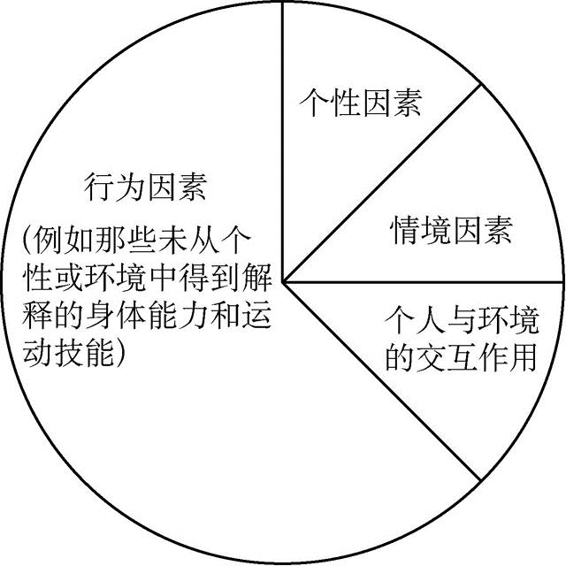 显然,加入了情境因素以后,我们可以对运动员的行为有更多的理解和更准确的解释。但是,圆圈中的最大部分仍被未得到说明的因素占据着。不应把这种不确定性解释为人格因素对运动成绩不重要。它只表明,运动成绩还受到许多其他因素的影响,如身体能力、运动能力以及任务难度等(Cox,1994)。