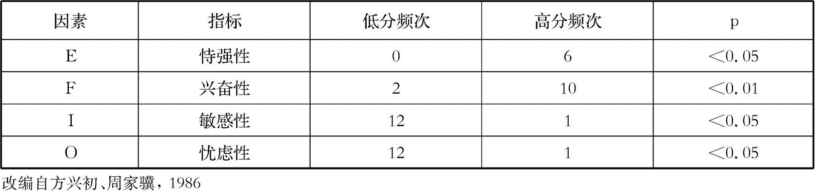 方兴初、周家骥(1986)曾对上海地区20名世界冠军、世界纪录创造者进行了16PF测验。结果发现,16项人格特征中有4项特征的高分(8—10分)频次和低分(1—3分)频次有可靠差异(表7-3),说明这些运动员的主要人格特征为:自信心、理智性、独立性、顽强性、好胜心均较强,并且轻松愉快,有耐心,有恒心,意气用事、拘谨等消极心理较少。